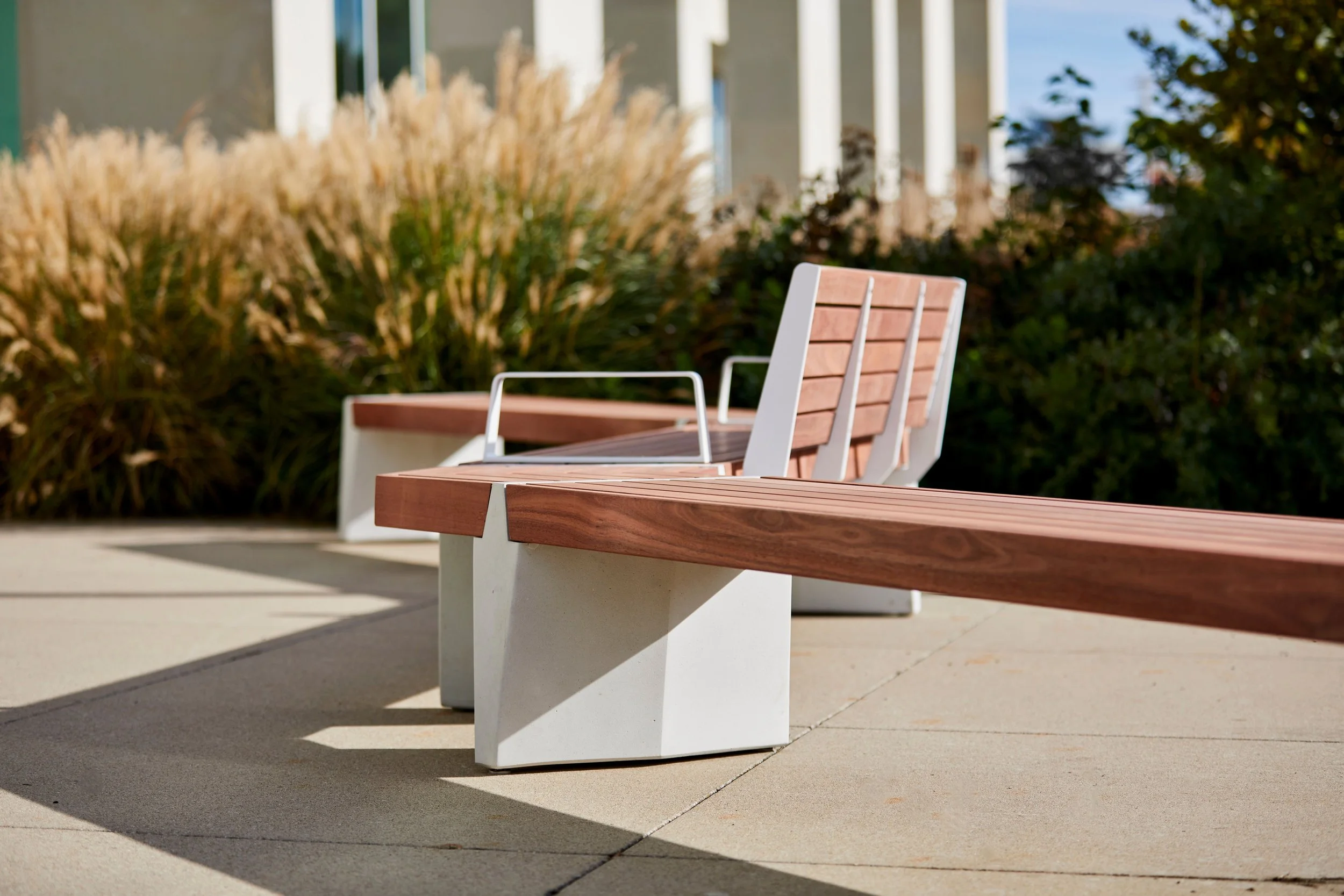 The STRATA Beam expansion enables designers and landscape architects to join STRATA Beam benches across a diverse array of configurations using Meldstone ultra-high performance concrete (UHPC) bridge legs and three different angle connectors in 90°, 60° and 45°. Like other STRATA Beam benches, STRATA Beam expansion benches can be specified backed or backless and with any combination of end and intermediate arms.