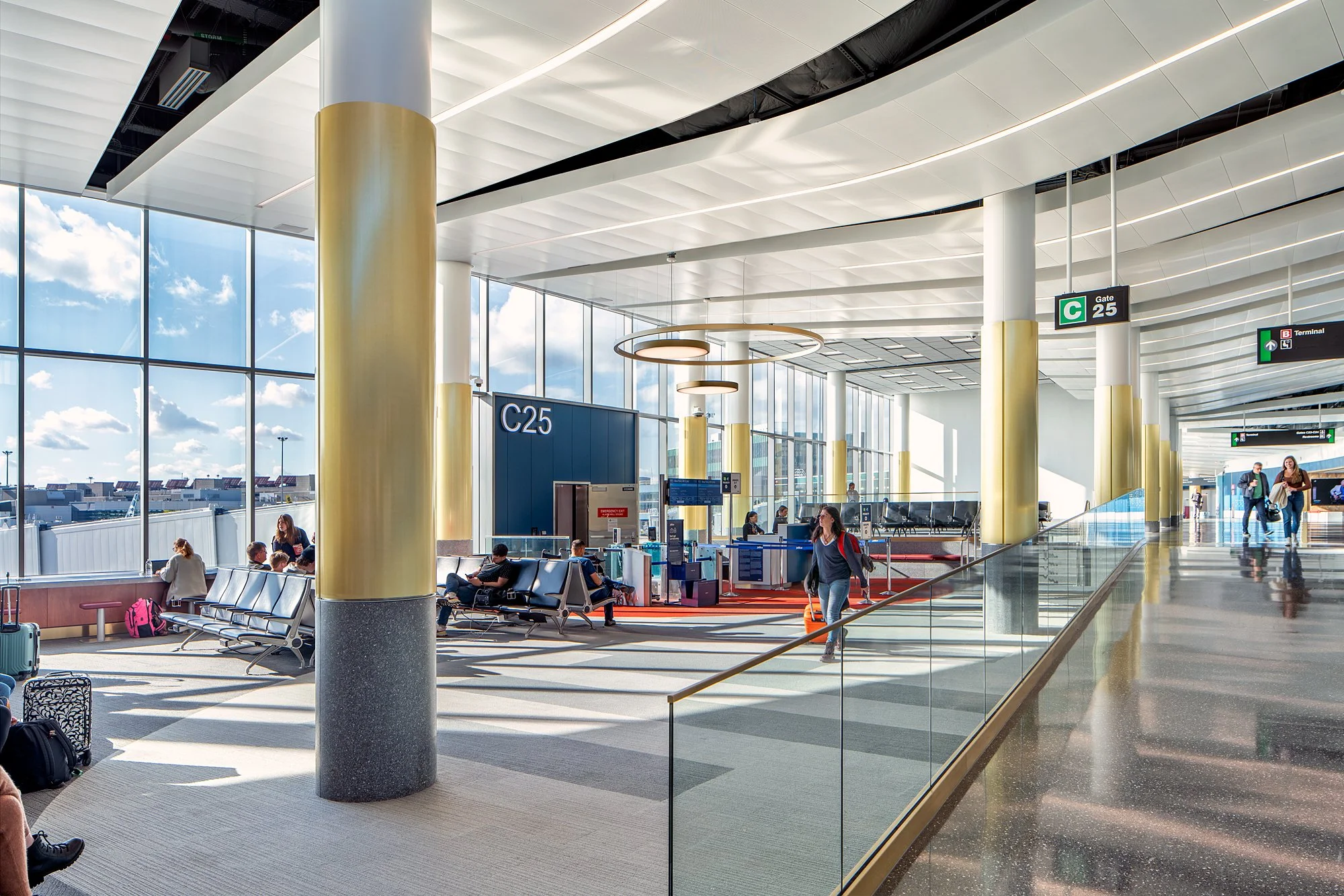 In high-traffic public spaces, material durability is a key consideration—designed with 100% recyclable solid-core aluminum, Móz’s Column solutions are able to withstand the wear and tear of high occupancies and disinfectants that occur in an airport setting. Produced in Móz’s Bay Area factory, each column arrived ready for installation, saving precious time in the field. Móz also worked with parent company Armstrong Ceilings to ensure the finishes were met on all edge and trim conditions, matching the columns and entry portals.