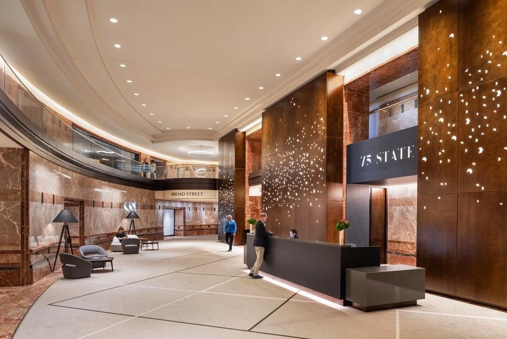 Móz Designs has created a striking custom metal feature wall installation at 75 State Street in Boston, MA. This installation, located in the crescent-shaped lobby, fuses modern functionality with the building's Art Deco character, serving as a focal point that captures visitors' attention. It consists of 72 custom aluminum panels covering 1,409 square feet, featuring laser-cut chevron patterns inspired by the building's exterior motifs, which collectively depict an artistic narrative of birds in flight.