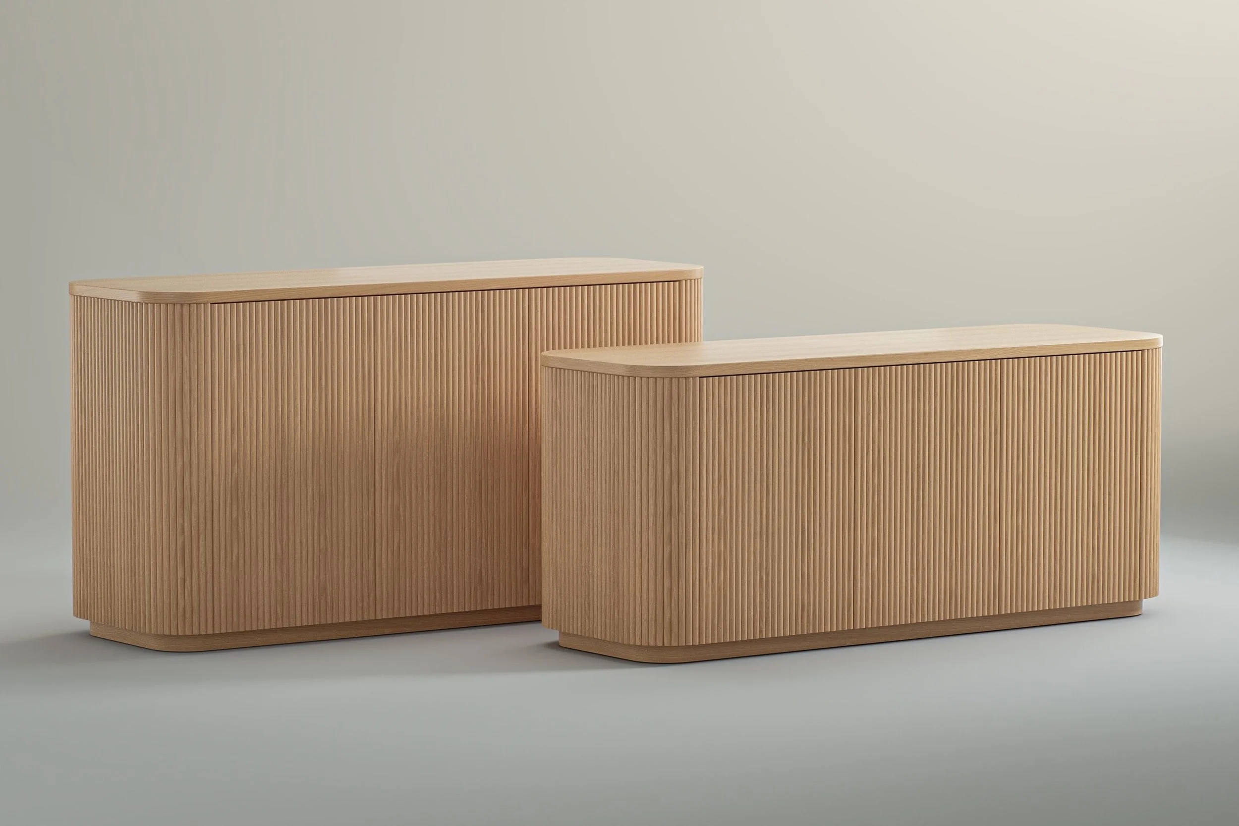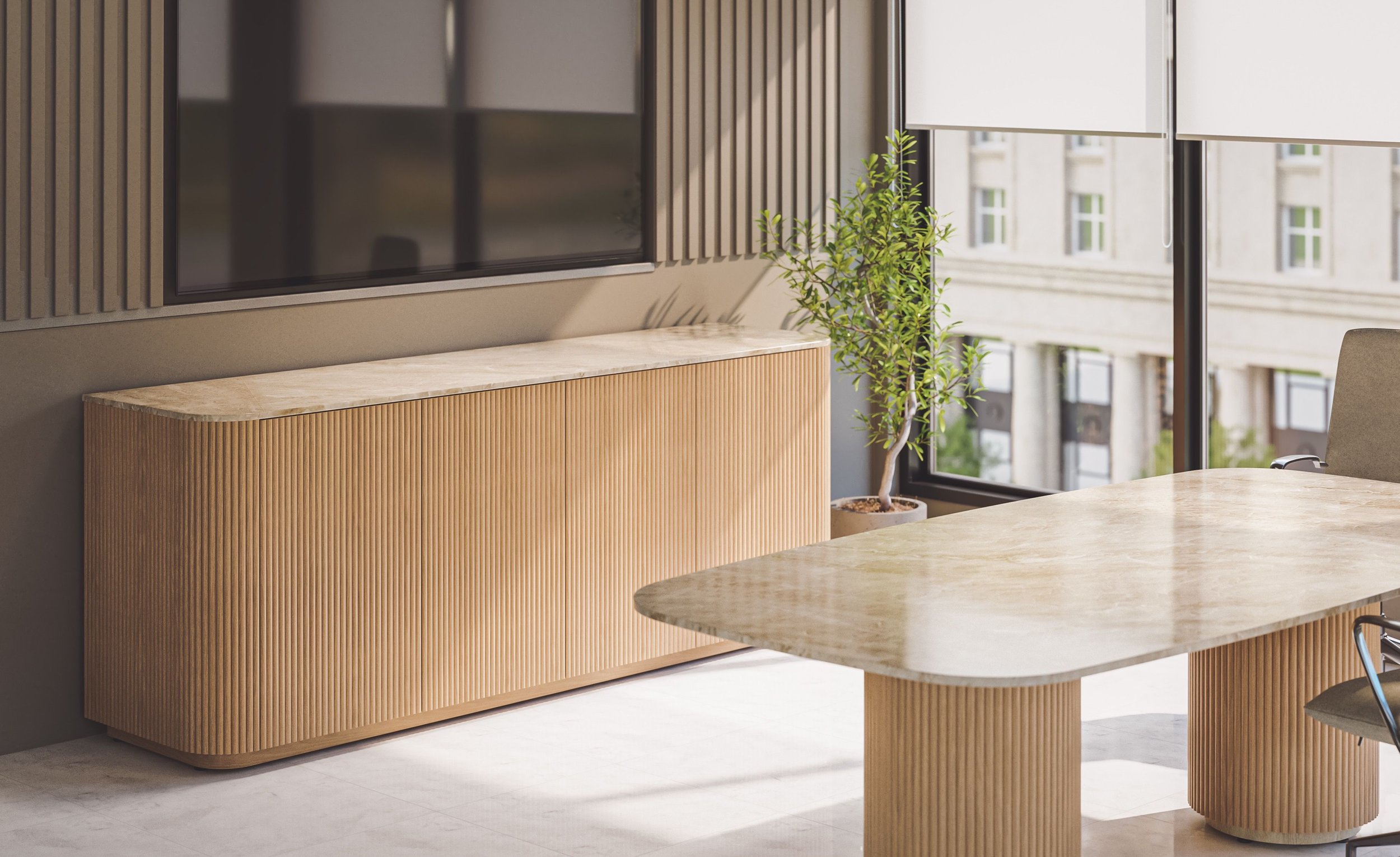 Expanding the design language of the Ollie table series, the credenza introduces a sculptural storage element that complements modern meeting environments while softening the look of traditional casework. The tambour wrap adds rhythm and texture to the piece, allowing storage to become part of the overall design story rather than a secondary utility element.
