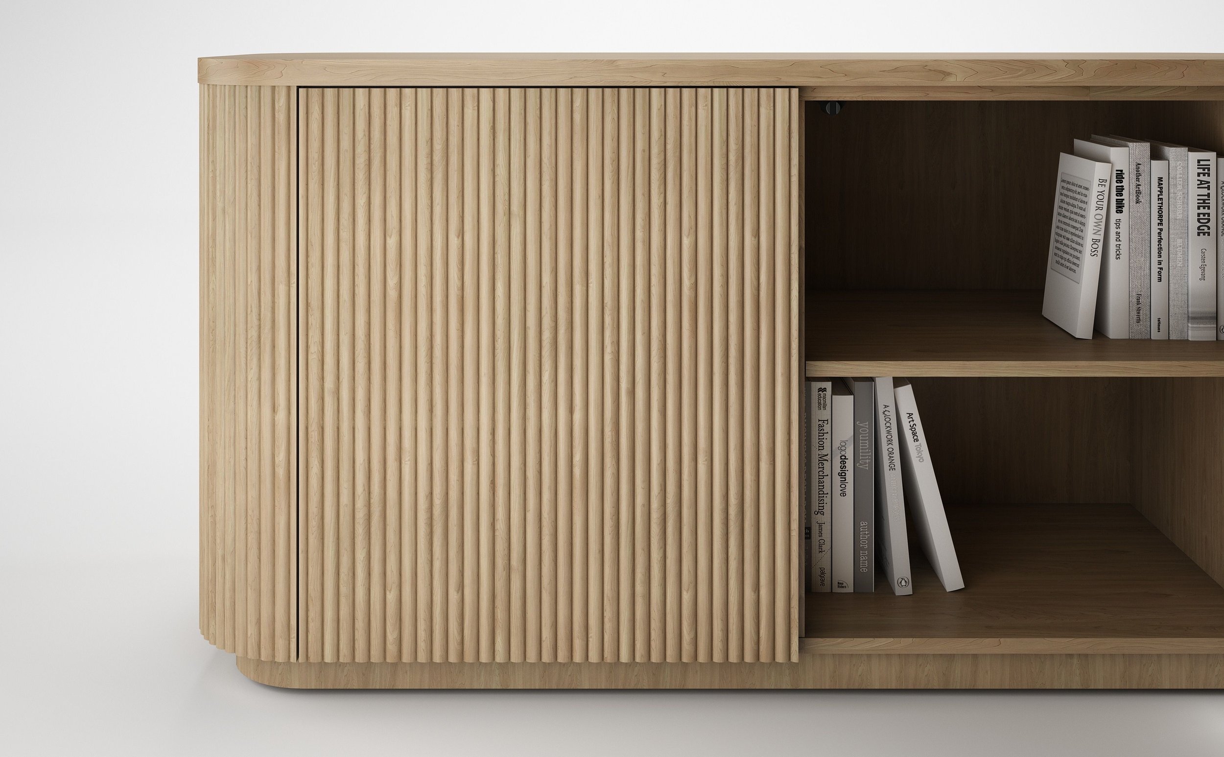 Two wrap configurations allow the credenza to adapt to different applications. A full tambour wrap features four radius corners, while a partial wrap option incorporates a flat veneer back with two square corners on the rear of the unit for placement against architectural surfaces.