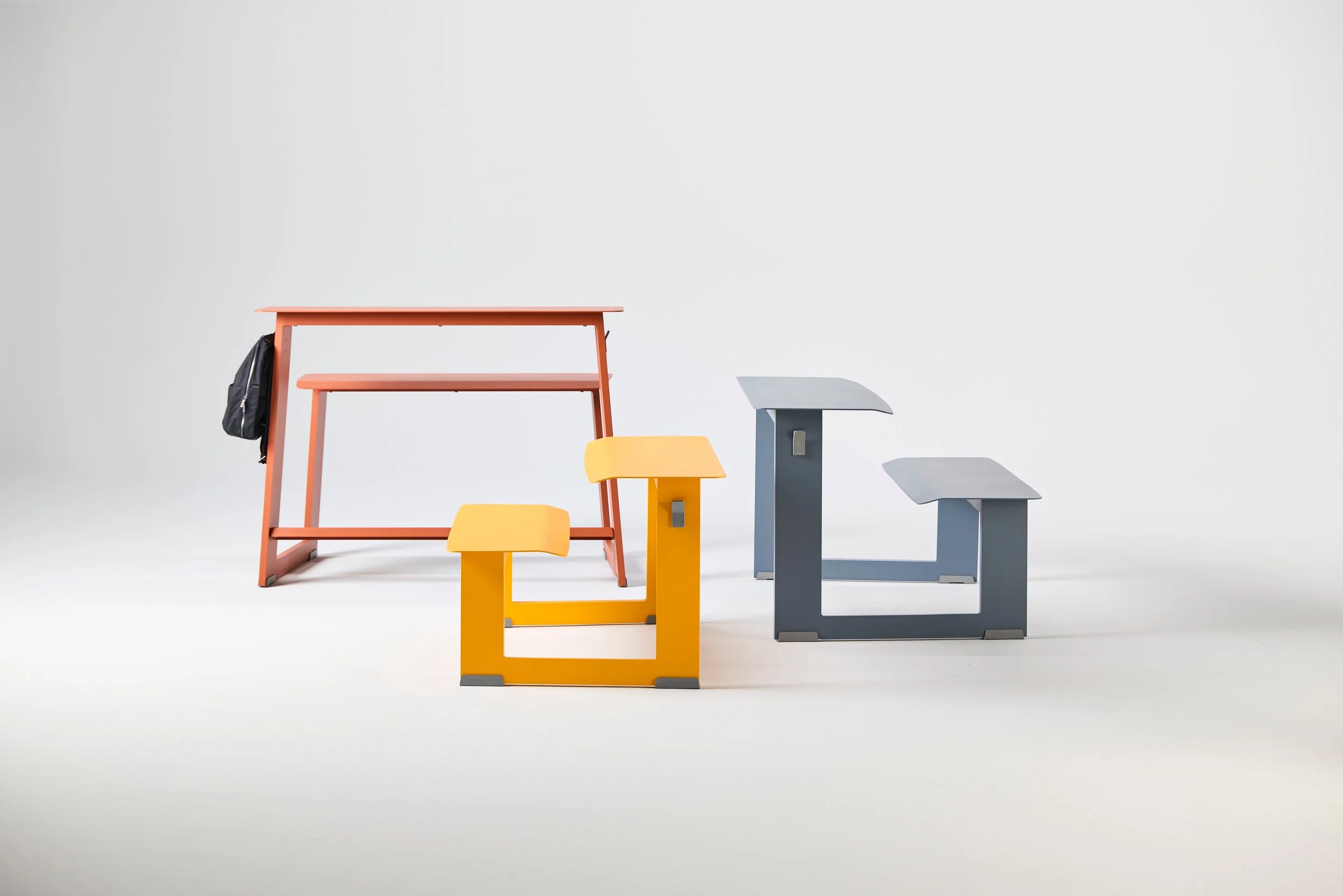The expanded offering includes a new tall with an integrated footrest, a mini ergonomically scaled for K–5 education environments, and a distinctive wedge that introduces fresh geometries and more interpersonal postures. The expansion also incorporates color-matched connector brackets to lock abutting units into stable configurations and a semi-circular umbrella hole option that creates a full standard umbrella opening when two units are placed face-to-face.